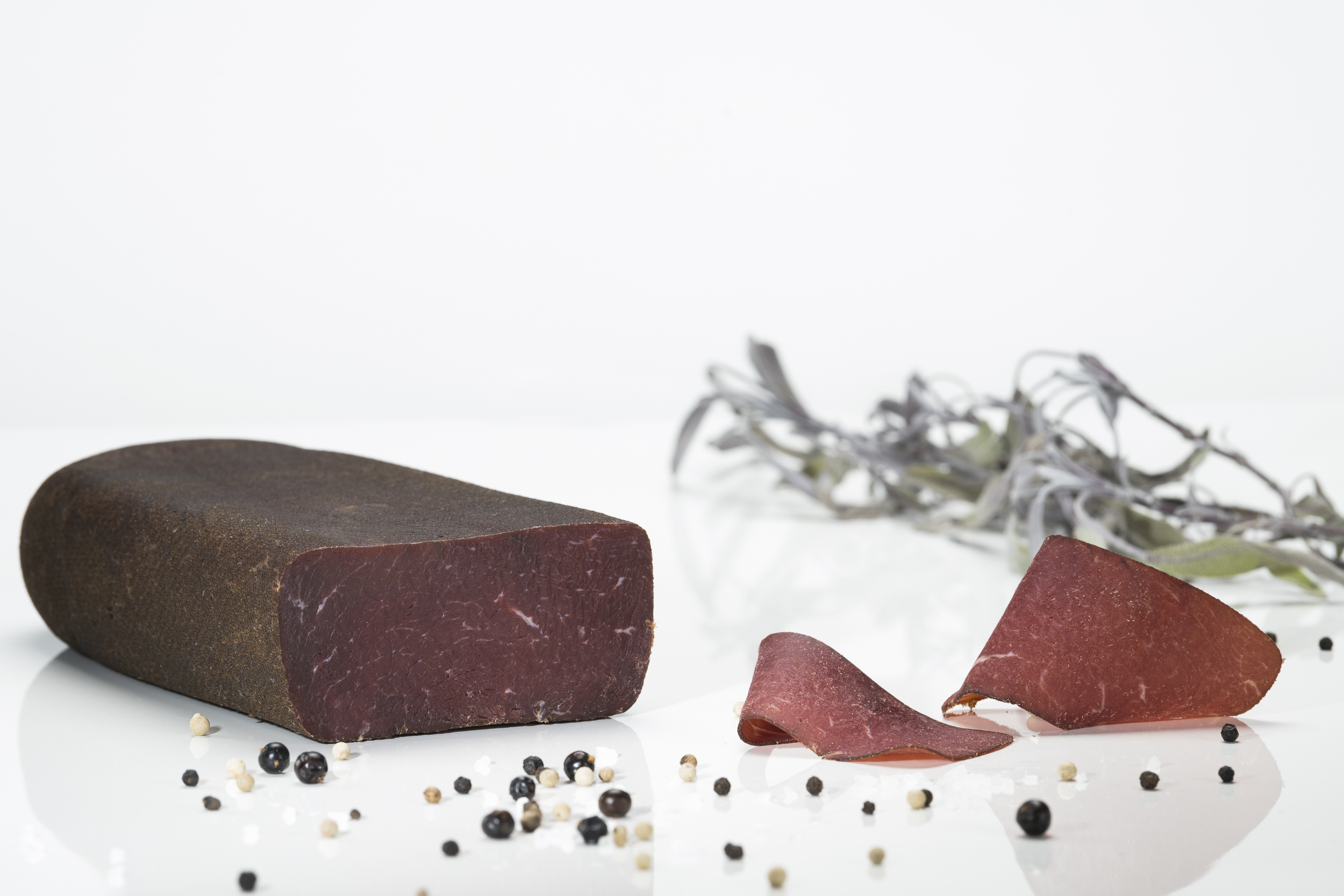 Hirschfleisch aus heimischen Wäldern wird mit einer Gewürzmischung aus Wacholder, Lorbeerblätter, Nelken, Ingwer und frischem Knoblauch veredelt. Dieser Rohschinken wird leicht geräuchert und reift ca. 4 Monate.