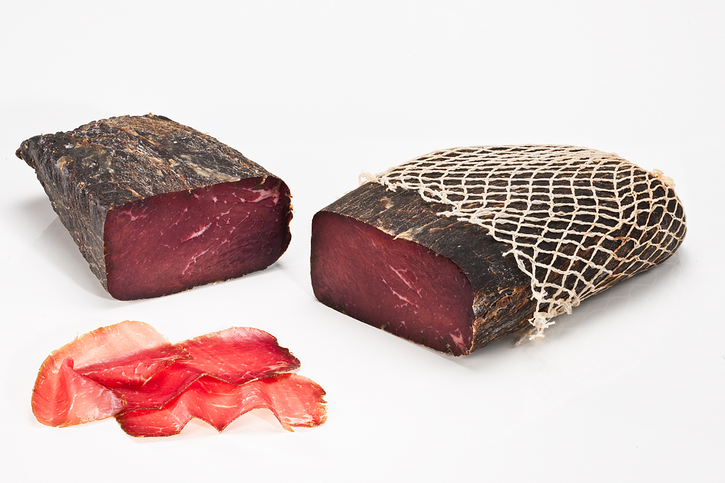 Ausgesuchte Edelteile aus dem Schlögel vom Almochsen oder Kalbin (Färse) werden nur mit Meersalz und einer Zuckermischung verfeinert. Man verzichtet auf andere Kräuter um damit den hervorragenden Eigengeschmack vom Fleisch erleben zu können.