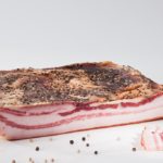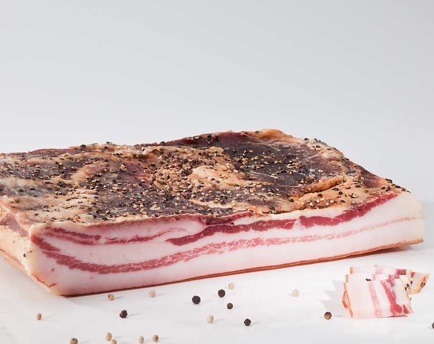 Bauchspeck vom Schwäbisch Hällischen Hausschwein. Nur mit Meersalz, Knoblauch und gebrochenen schwarzen Pfeffer gewürzt.