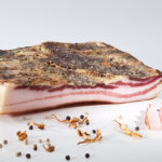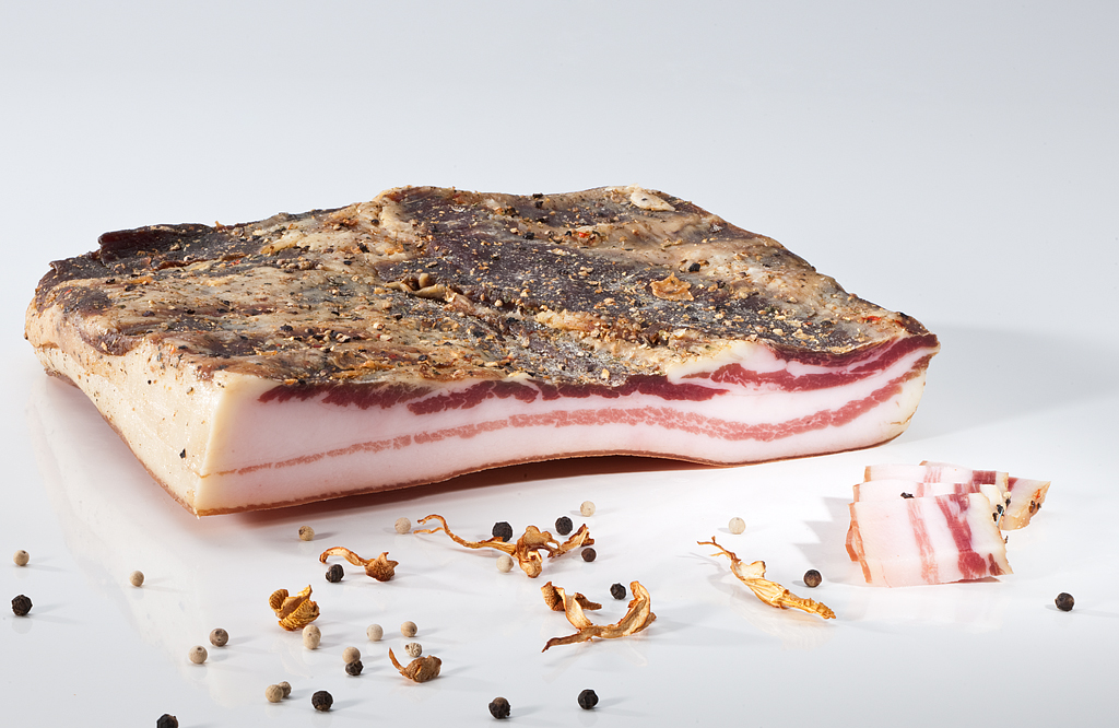 Bauchspeck vom Hausschwein wird mit Meersalz, Pfeffer, Wildkräuter und getrockneten Eierschwammerln (Pfifferlinge) verfeinert. Dieser Speck reift ca 13 Wochen an der Luft.